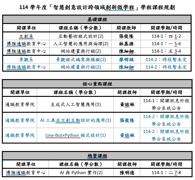 114-1「智慧創意設計跨領域創新微學程」課程開課資訊